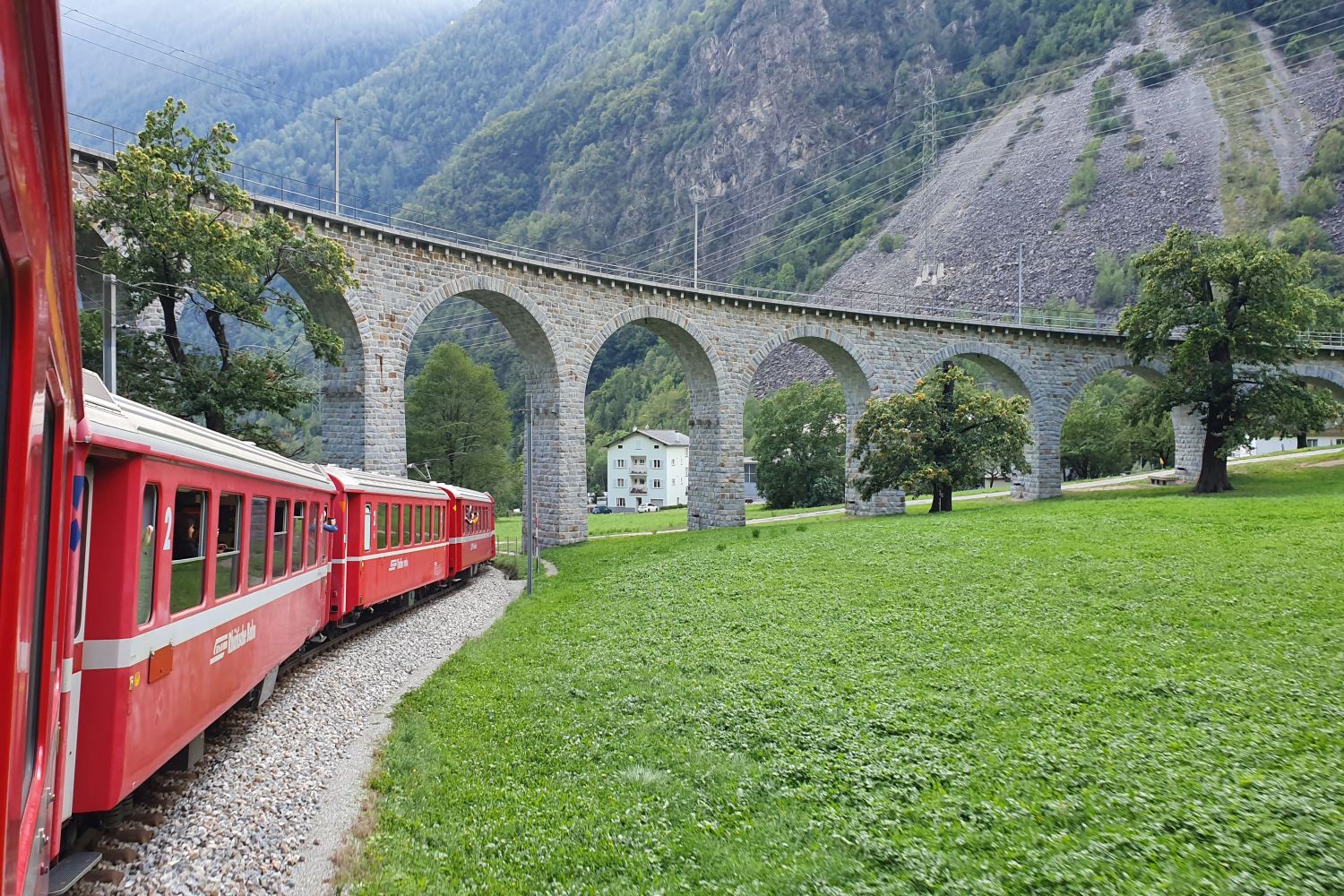 Die roten Züge der Rhätischen Bahn sind ständiger Begleiter auf dieser Tour. Es ist eine außerordentliche Ingenieursleistung, wie die Bahntrasse sich über die Berge windet, über Viadukte, in Schleifen und Tunnels und Kreisviadukten. Kein Wunder, dass die Strecke zum UNESCO-Weltkulturerbe ernannt worden ist. Vor allem die Strecke zwischen Bergün und Preda ist sagenhaft. Der Zug wechselt so oft die Talseite, kurvt und kreist sich Richtung Albula Tunnel, dass man gar nicht mehr weiß, was einem geschieht.